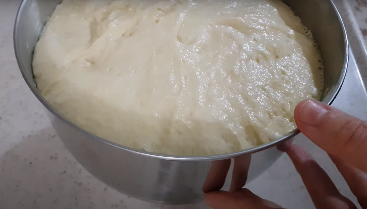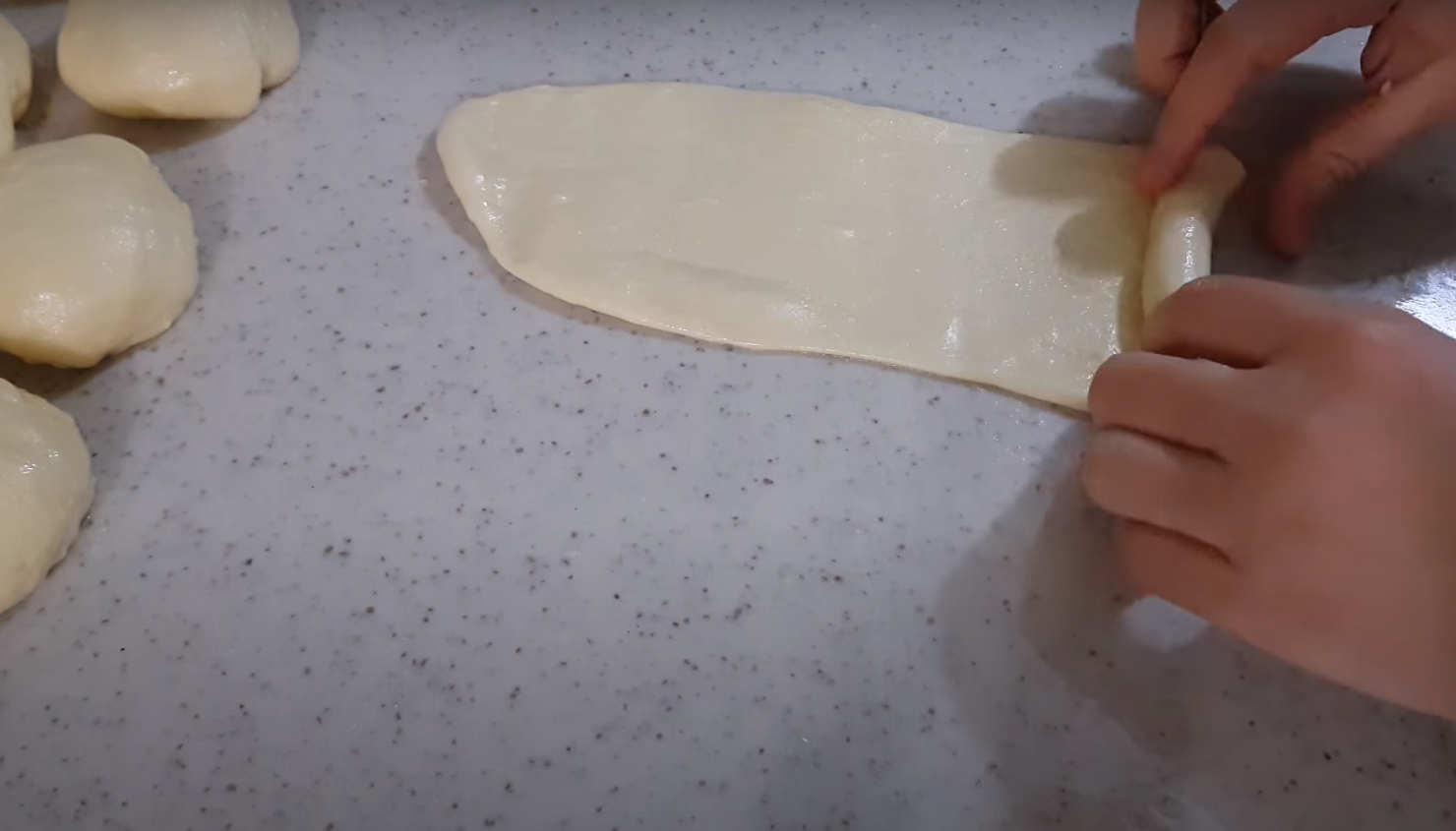 Ponownie połącz. Wymieszaj razem mąkę i sól. Zajmie to ok. 5 minut. Pozostawić do odpoczynku na ok. 90 minut. Posmaruj powierzchnię roboczą olejem, a następnie przełóż na nią kwaśną masę. Uformować 10 równych kulek. Każdą kulkę rozwałkować na owalny kształt, a następnie zwinąć w długi rulon.