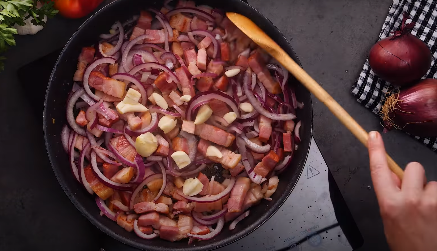 Umieść ziemniaki w rondlu i gotuj przez 25 minut. Obierz ziemniaki, a następnie pokrój je na mniejsze kawałki. Na patelni podsmaż boczek. Umyj cebulę i pokrój ją na połówki. Dodaj je na patelnię razem z boczkiem. Wymieszaj składniki i smaż przez kilka minut. Dodać posiekany czosnek.