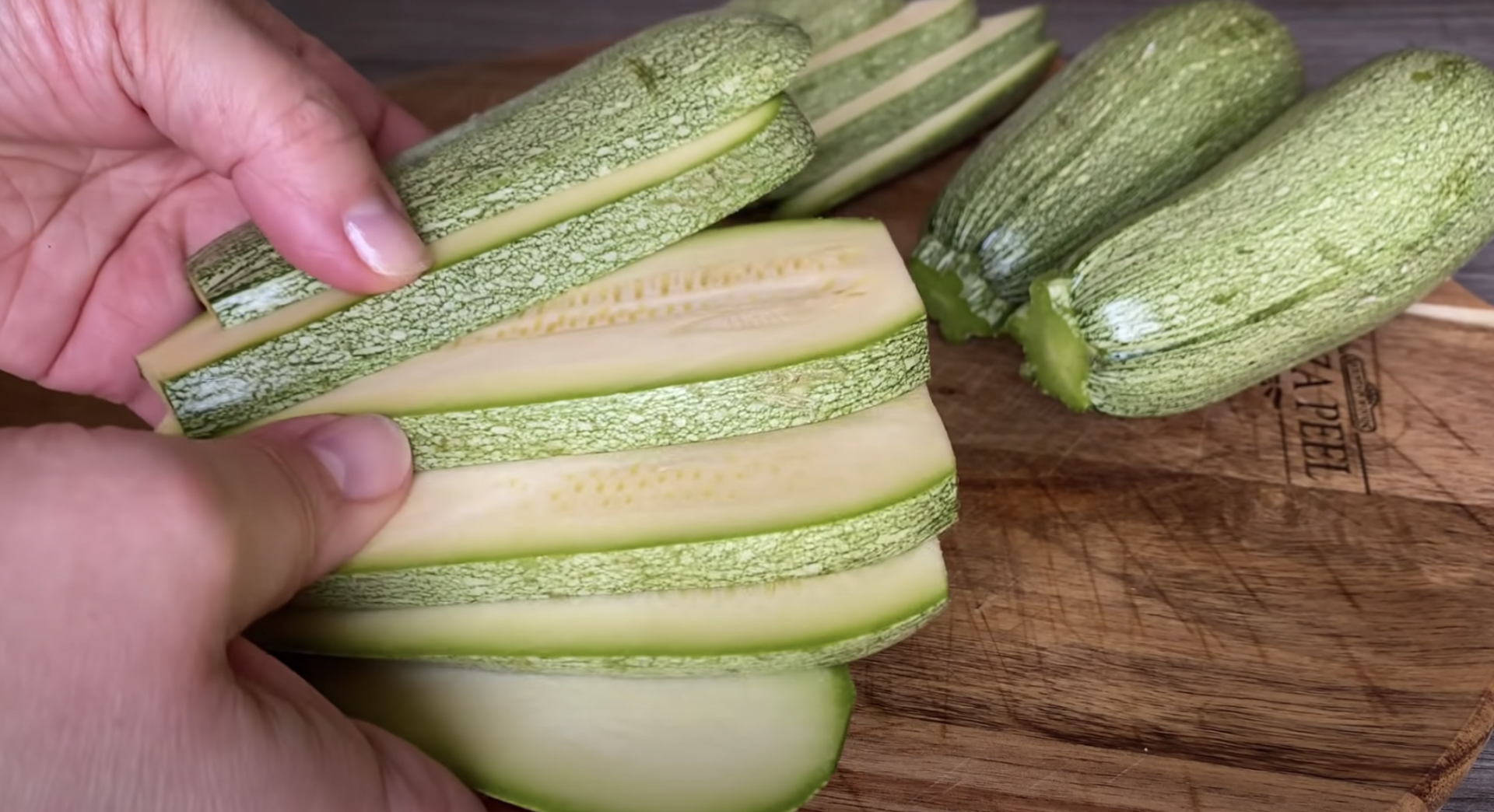 Cukinię myjemy, suszymy i kroimy w dość cienkie plasterki.