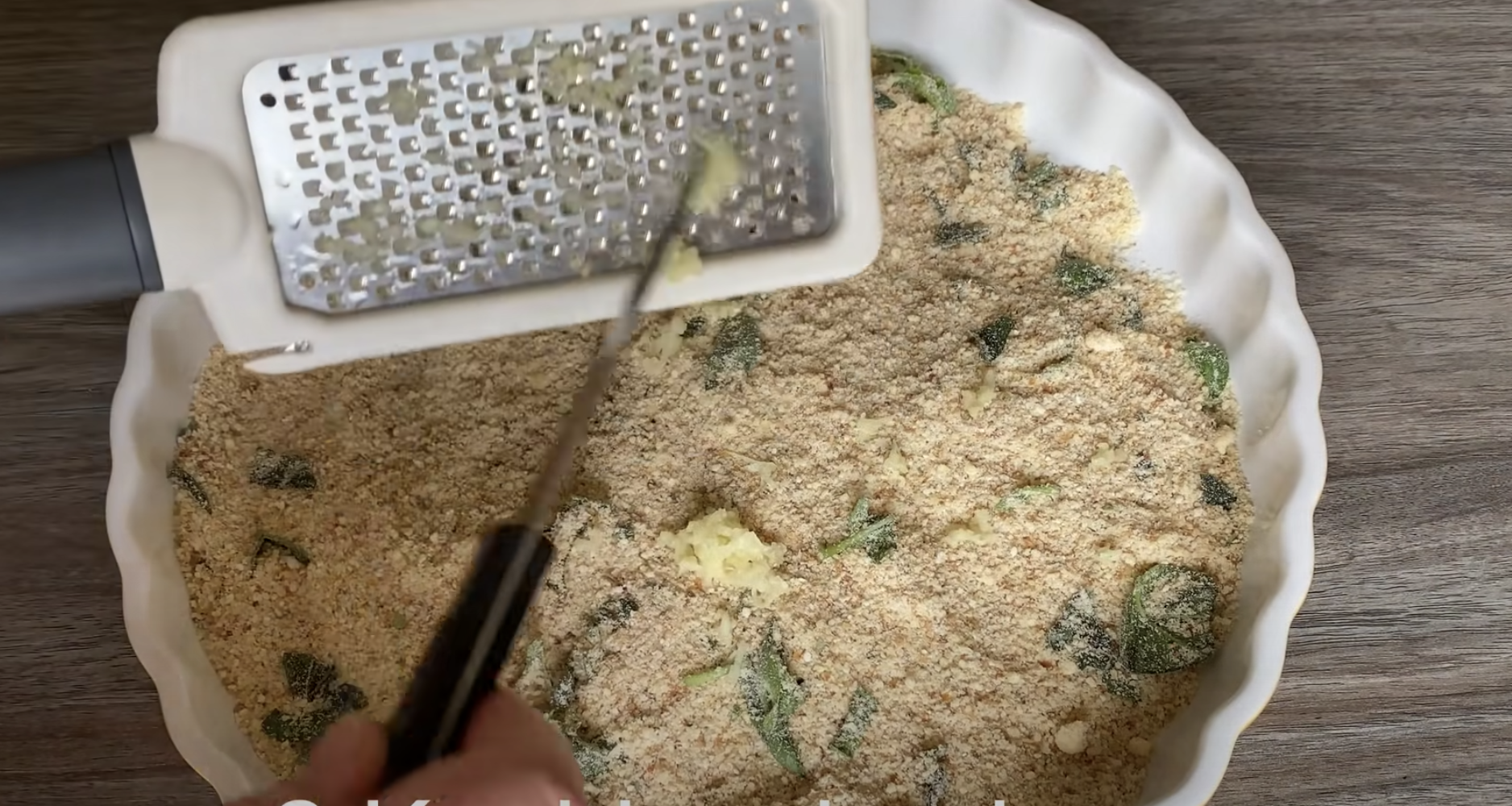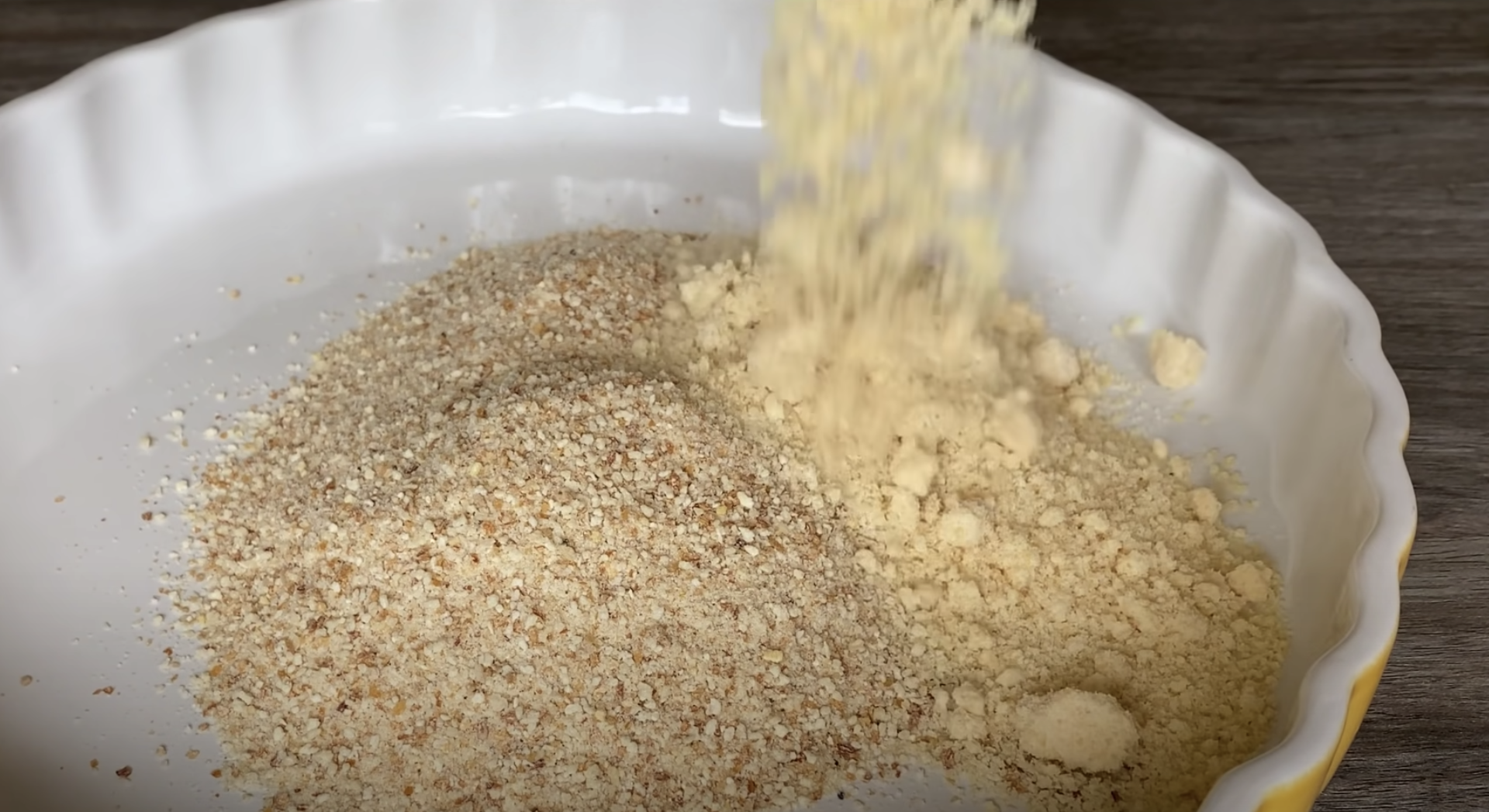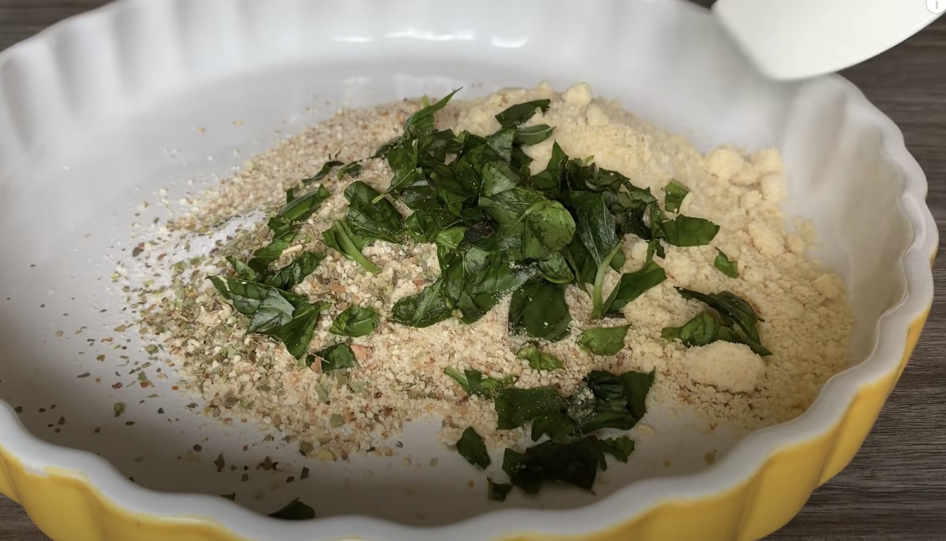 Do miski wsypujemy bułkę tartą, parmezan i suszone oregano.