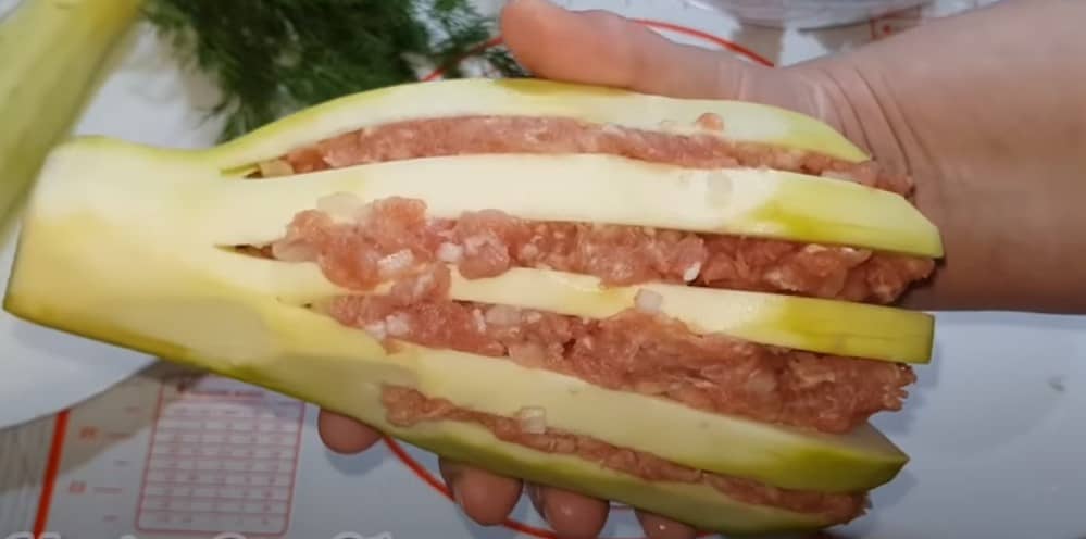 Cukinię umyj, obierz, a następnie ostrym nożem na całej długości zrób głębokie nacięcia na ok. 2/3 głębokości. Powstałą w ten sposób harmonijkę posól i odczekaj ok. 15 minut.
