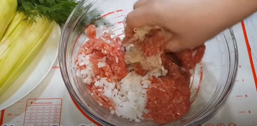W czasie gdy cukinia puszczać będzie sok, przygotuj mięsny farsz. Do mielonego mięsa dodaj posiekaną w kostkę cebulę, ulubione przyprawy oraz drobno posiekane ząbki czosnku.