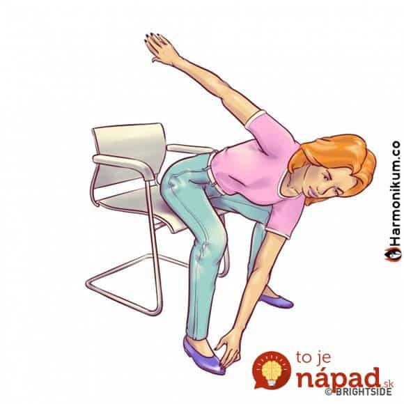 Usiądź na brzegu krzesła. Uważaj, żeby zachować równowagę. Pochyl się z wyprostowanym kręgosłupem i dotknij prawą dłonią palców lewej stopy. Powtórz z drugą dłonią i stopą. Ćwiczenie najlepiej jest wykonać od 20 do 30 razy.
