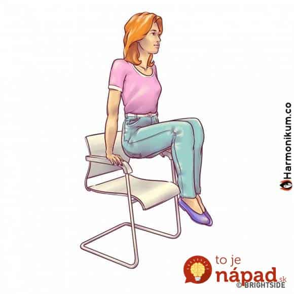 Siedząc na krześle, chwyć jego oparcie rękami. Następnie unieś złączone nogi do klatki piersiowej. Ćwiczenie należy powtarzać od 20 do 30 razy.