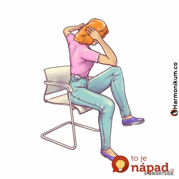 W tym ćwiczeniu angażujesz tułów i ramiona. Usiądź na krześle z lekko rozsuniętymi stopami, a następnie zegnij w łokciach ręce i przekręć tułów. Powtarzaj od 10 do 20 razy.