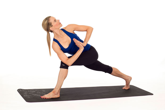 Stań. Zginamy kolano w stawie kolanowym i robimy krok do przodu. Drugą nogę stawiamy za sobą i opieramy ją na palcach. Łokieć powinien znajdować się po zewnętrznej stronie zgiętego kolana. Dłonie powinny być złączone z wewnętrznymi powierzchniami obu rąk. Utrzymaj tę pozycję przez 30 sekund. Kontynuuj ćwiczenie na przeciwnej nodze.