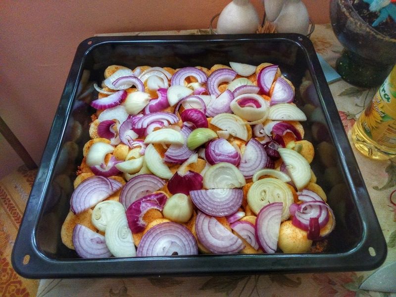 Cebulę pokrój w krążki, zaś boczek w drobną kostkę. Obydwa składniki ułóż na ziemniakach.