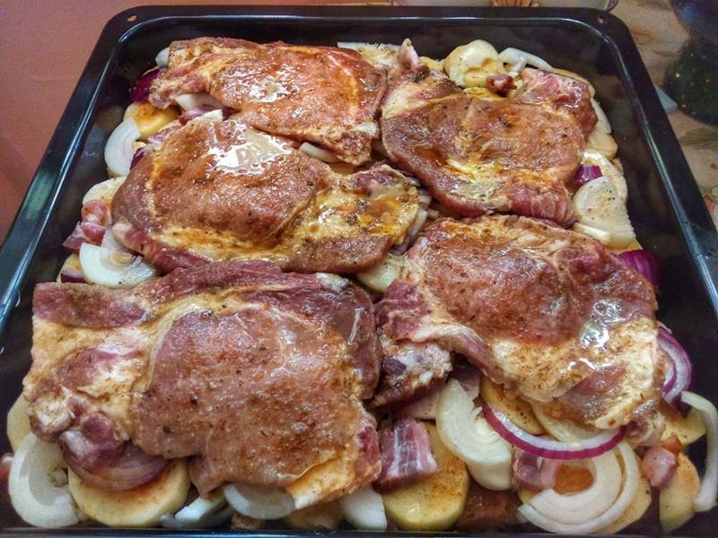 Na wstępie przygotuj marynatę z oleju, miodu, piwa i przyprawy do gyrosa. Na głęboką blachę do pieczenia ułóż ziemniaki i posmaruj je cienką warstwą marynaty. Mięso pokrój w równej grubości plastry. Następnie pozostałą część marynaty zużyj do karkówki.