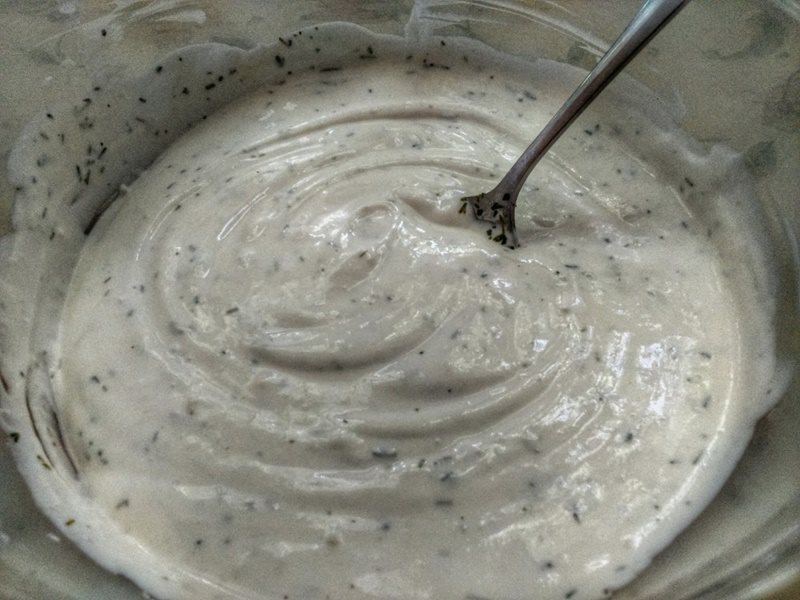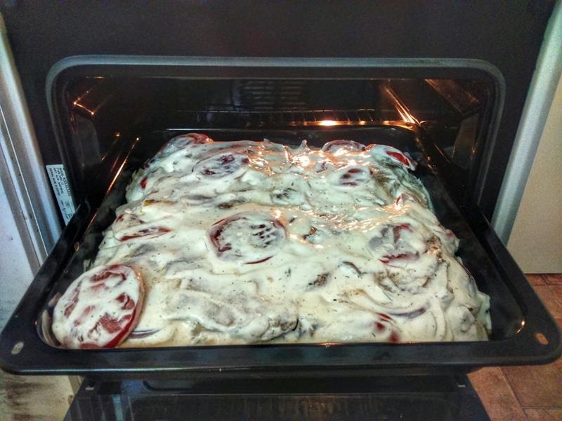 W międzyczasie przygotuj sos do tego dania ze śmietany, przeciśniętego przez praskę czosnku, pieprzu, soli i ulubionych przypraw.