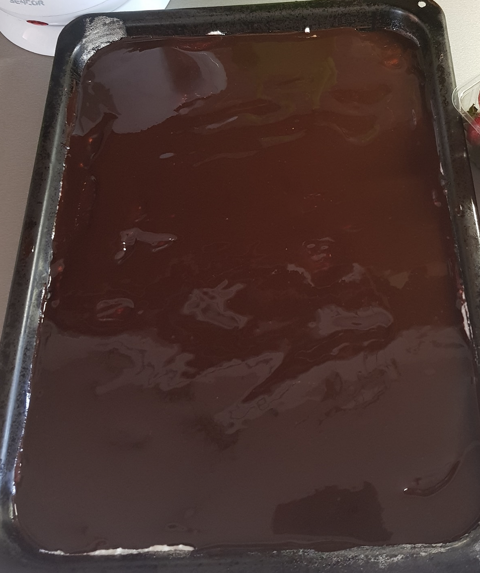 Do kremu dodać polewę czekoladową. Śmietankę delikatnie podgrzać i dodać posiekaną czekoladę. Mieszać, aż czekolada się rozpuści. Rozprowadź polewę na wierzchu deseru. Polewa będzie dobrze przylegać do kremu. Aby przyspieszyć przygotowanie polewy, można użyć kuchenki mikrofalowej.