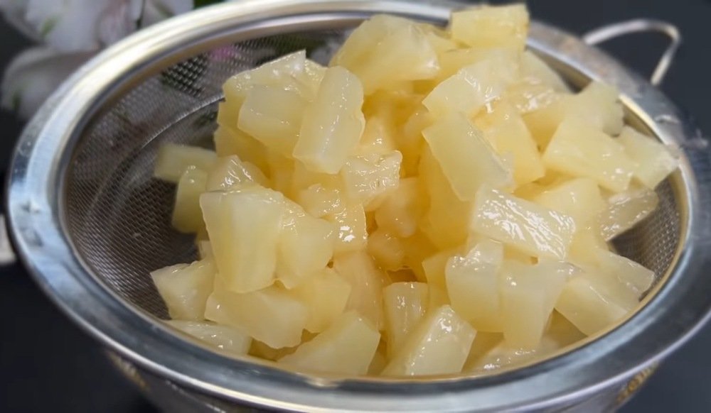 Rozpocznij od otwarcia słoika ananasów. Odcedź owoce, ale syrop zatrzymaj – przyda się później.