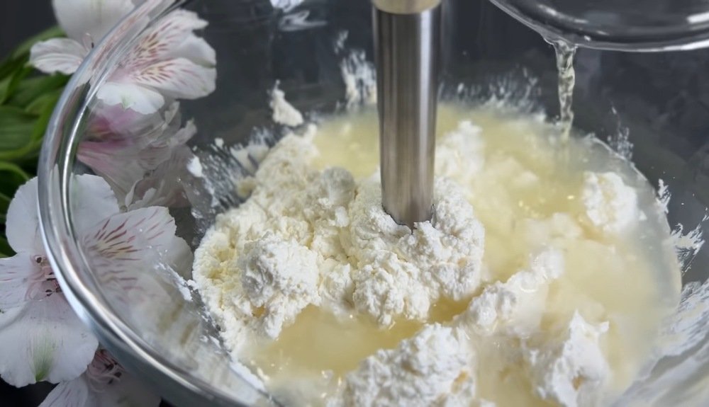 Do masy twarogowej dodajemy żelatynę i miksujemy do uzyskania jednolitej konsystencji.