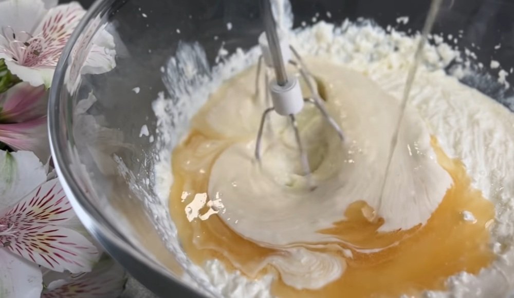 Twaróg blendujemy, dodając do niego ananasowy syrop.