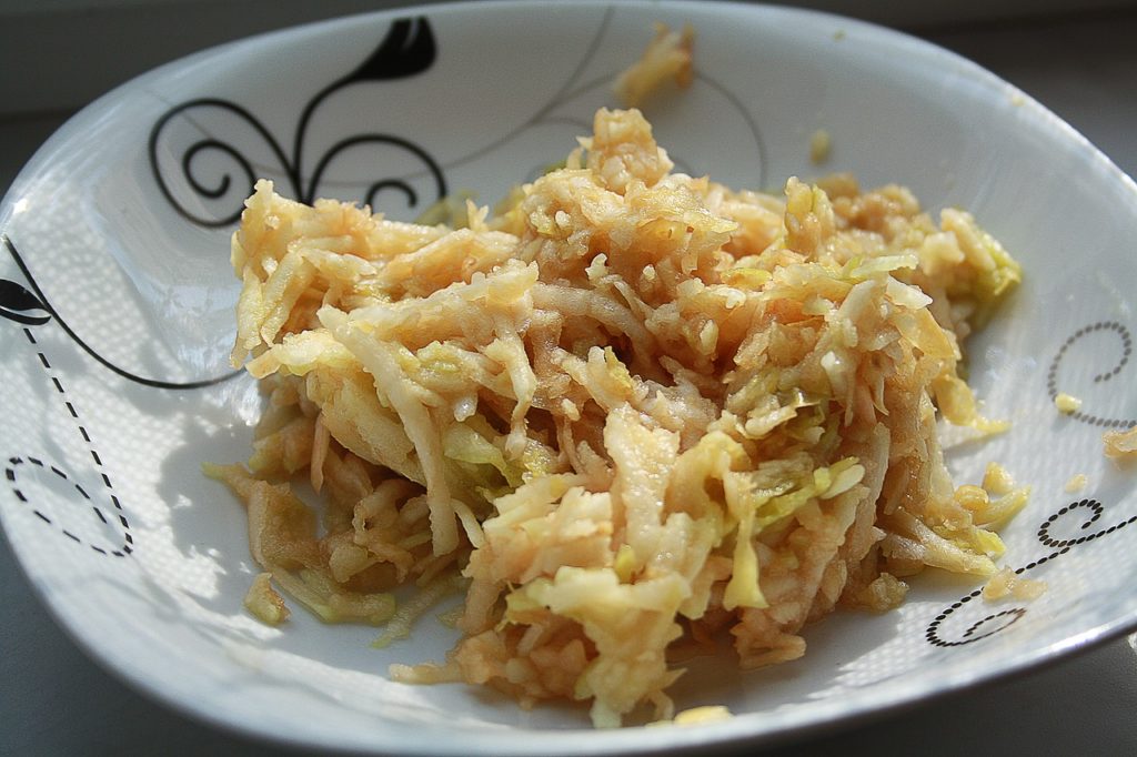 Obrane jabłko zetrzyj na tarce o grubych oczkach, twarożek dokładnie rozdrobnij widelcem i dodaj je do masy.