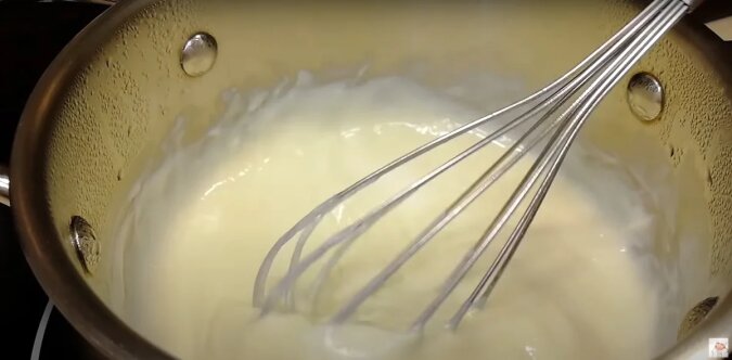 Następnie mieszam trzepaczką do momentu zniknięcia grudek. Mleko skondensowane i resztę mleka wlewam do garnka.