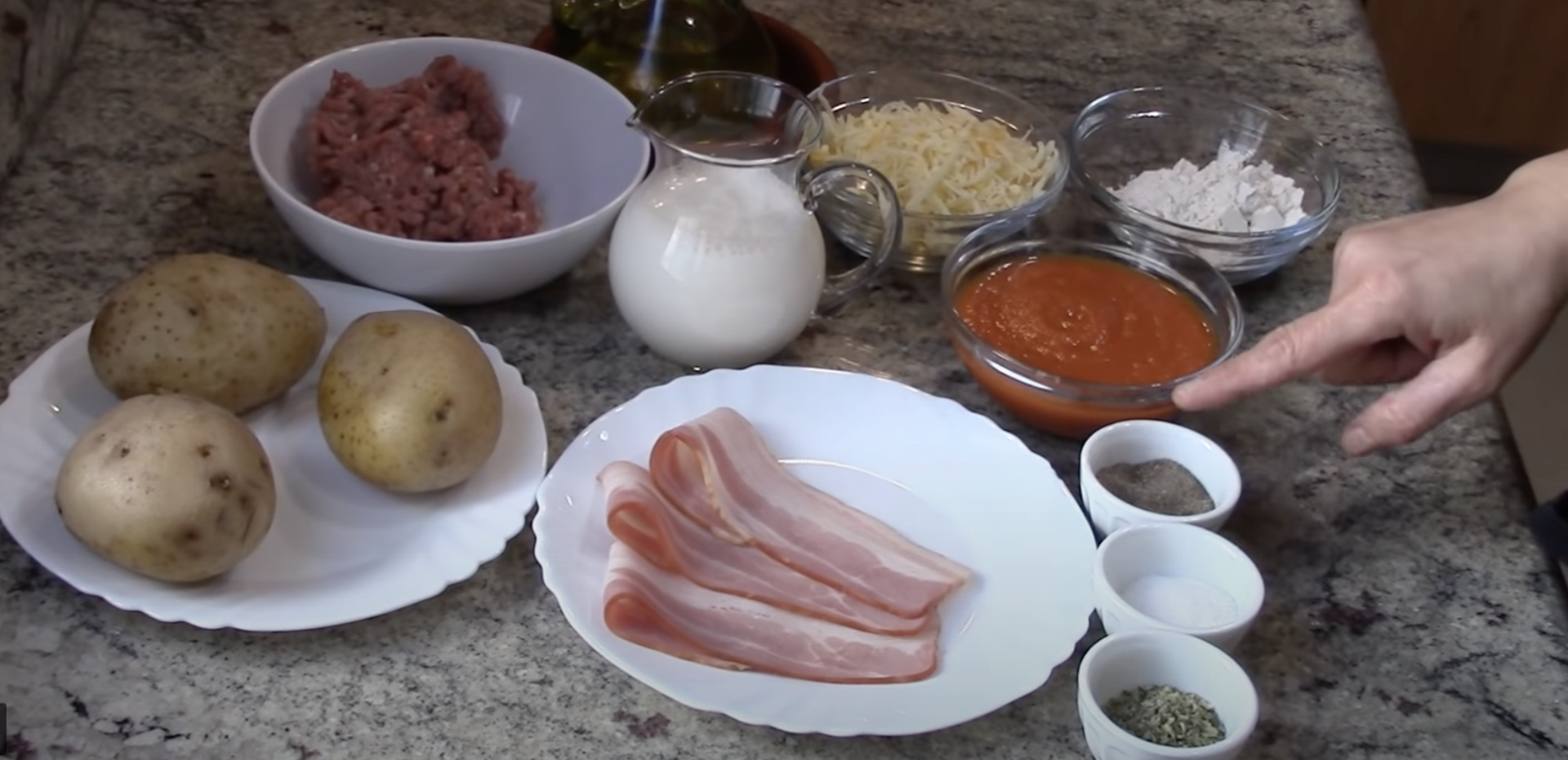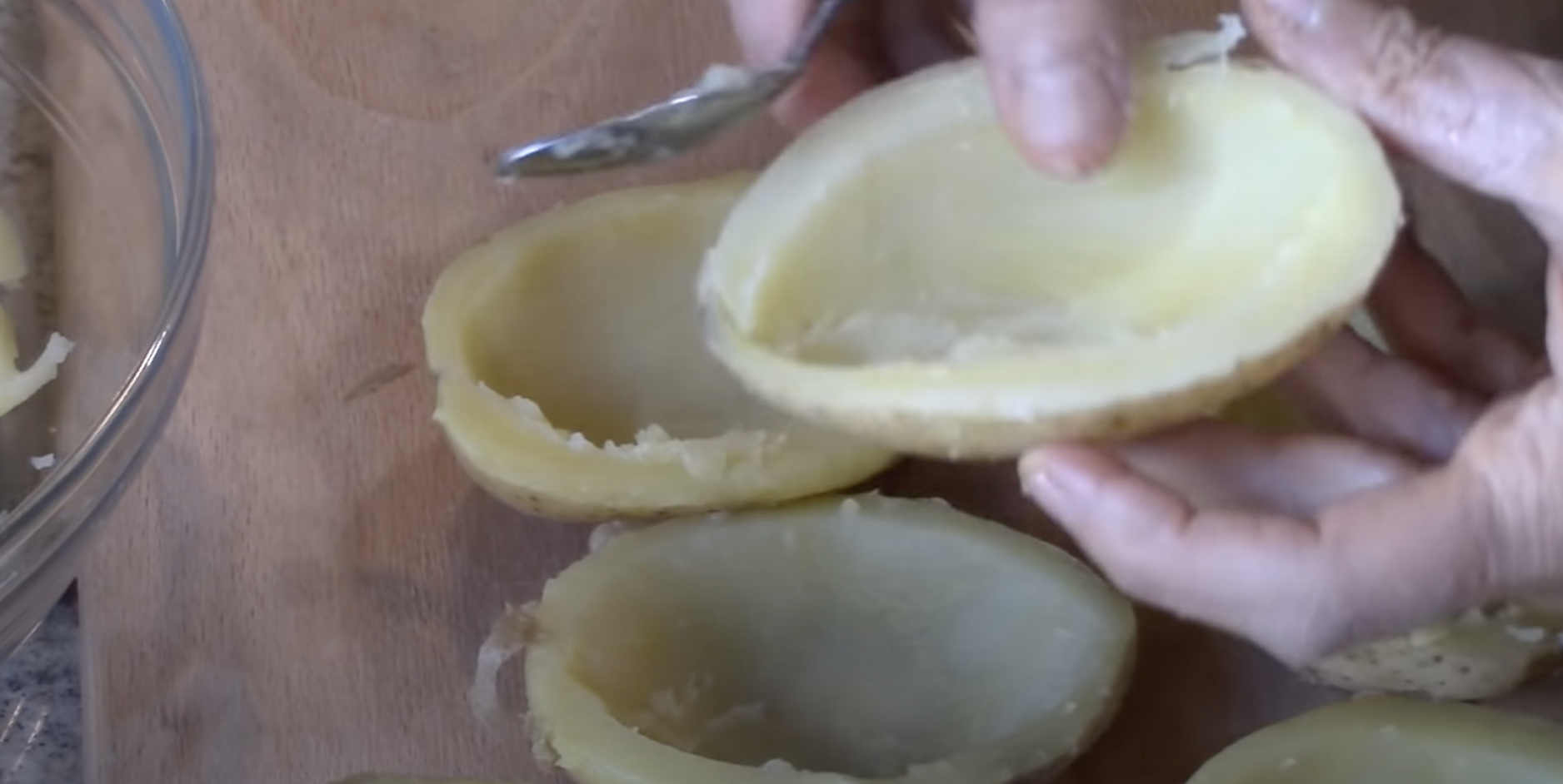 Pokrój plastry boczku na niewielkie kawałki, dodaj je do mielonego mięsa i je duś. Gdy ziemniaki będą już miękkie, przekrój je na pół i wydrąż środek.