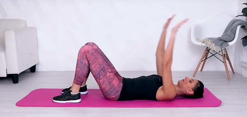 Po wykonaniu powyższych ćwiczeń połóż ręce za głową i weź głęboki oddech. Następnie delikatnie opuść ręce, tak aby palce nie dotykały podłogi. Tę czynność należy wykonywać przez minutę.