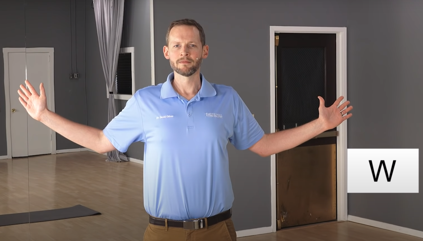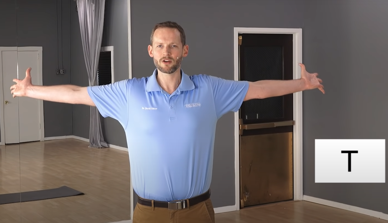 W takiej pozie należy również wytrzymać kilka sekund, a potem przejść do pozycji T. Jest to moment, w którym otwieramy klatkę piersiową. Ręce szybują w tył i w takiej pozie wytrzymujemy kilka sekund.