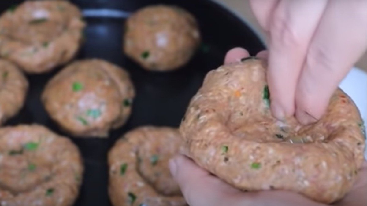 Połącz wszystkie składniki ręcznie, aż uzyskasz gładką pastę. Użyj oleju roślinnego do smarowania rąk i odrywaj kawałki mięsa. Uformuj mięso w kulkę i umieść ją na blasze do pieczenia. Kontynuuj ten proces z pozostałą mieszaniną, aż będziesz zadowolony. Użyj palców, aby utworzyć rowek w każdej kulce. Piec danie w piekarniku w temperaturze 180°C przez 20 minut.