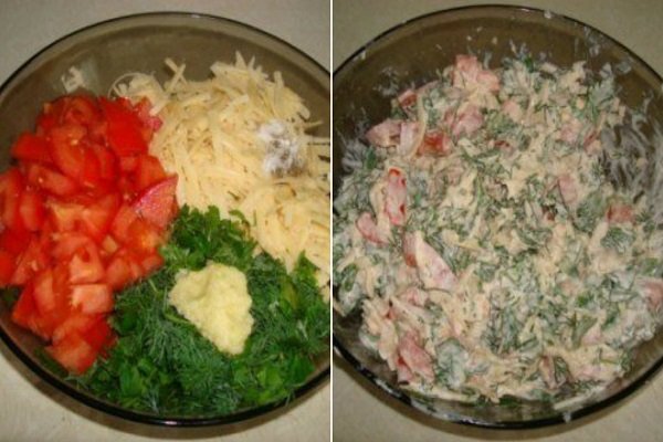 W celu przygotowania pierzynki posiekaj pomidory, czosnek i zioła, a ser zetrzyj na tarce o grubych oczkach. Dodaj śmietanę, sól i pieprz. Wymieszaj składniki.