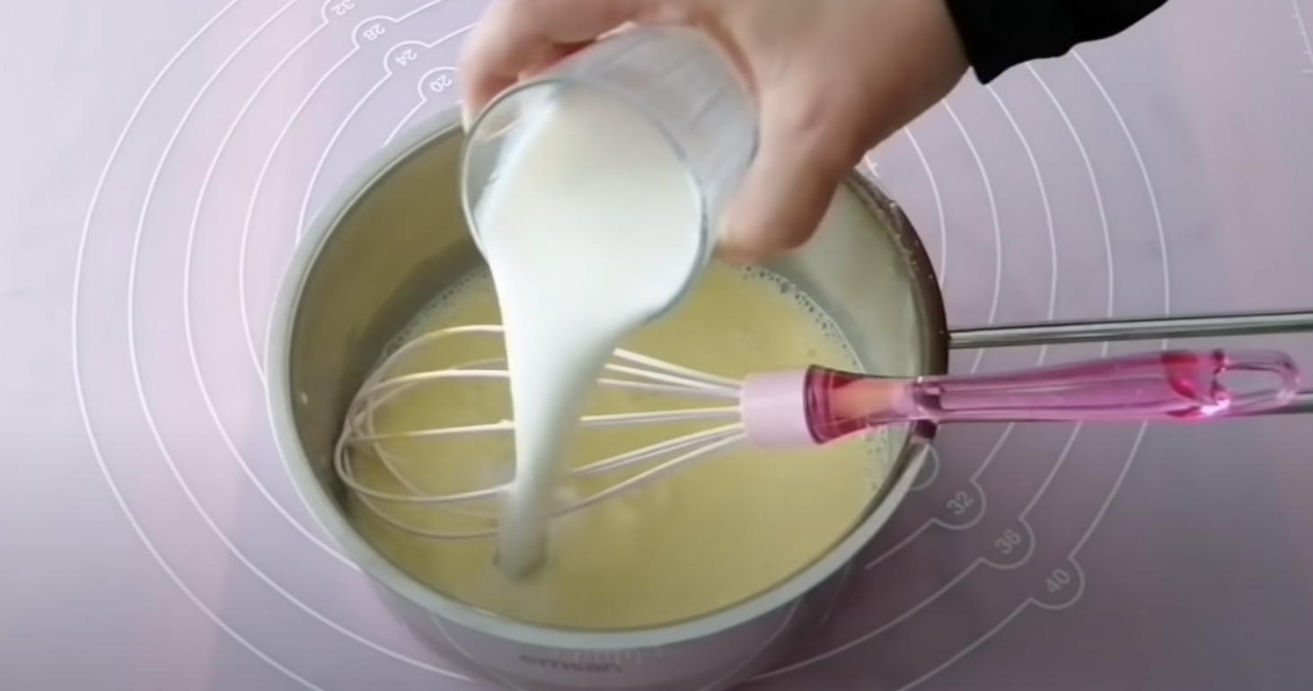 Zacznij od przygotowania kremu. W rondelku podgrzej mleko i wymieszaj ze skrobią. Na koniec wbij całe jajka.