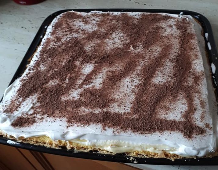 Rozłóż masę jabłkową na ciastkach, wygładź i ostudź. Ugotuj gęsty budyń z mleka, 1 opakowania budyniu waniliowego i cukru. Ostudź, dodaj miękkie masło i dobrze ubij. Ułóż masę budyniową na jabłkach, wyrównaj i rozprowadź na wierzchu ubitą śmietanę kremówkę (możesz dodać do niej cukier puder według uznania).