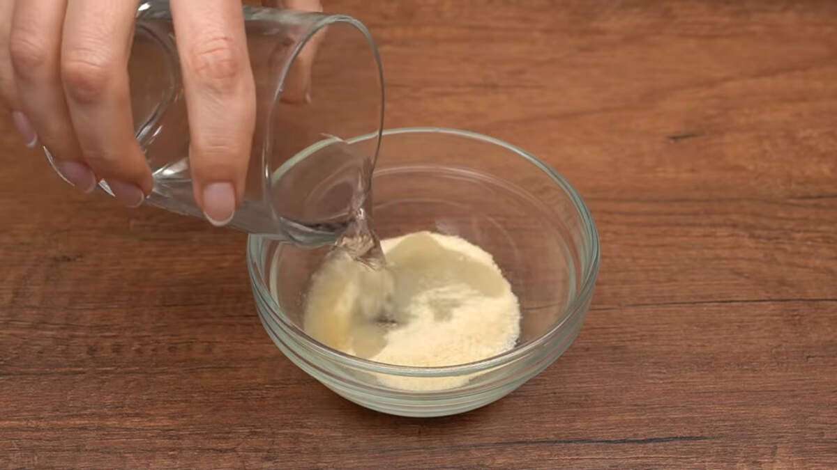 Żelatynę zalać zimną przegotowaną wodą i odstawić na 10 minut. Następnie rozpuść w kuchence mikrofalowej i dodaj kefiru. Dobrze wymieszaj.