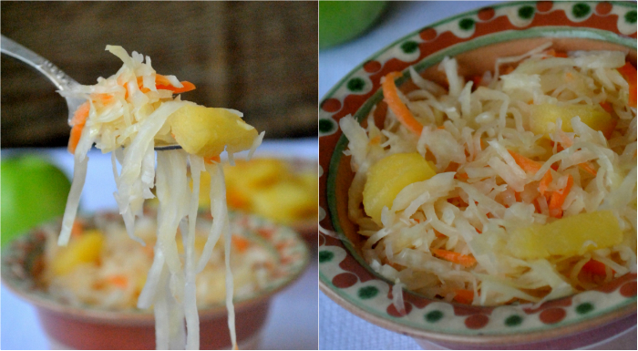 Zacznij od poszatkowanej kapusty oraz starcia jabłek i marchwi. Całość umieść razem w misce i według uznania dodaj sól. Jeśli wolisz bardziej wyczuwalny smak jabłka pokrój je w plasterki. Wymieszaj całość dokładnie za pomocą rąk, tak aby kapusta puściła sok.