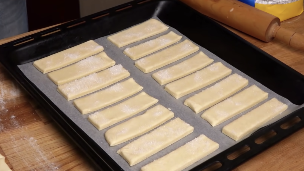 Następnie pokrój ciasto na kawałki i posyp cukrem. Piec w piekarniku w temperaturze 200° Celsjusza przez około 20 minut.