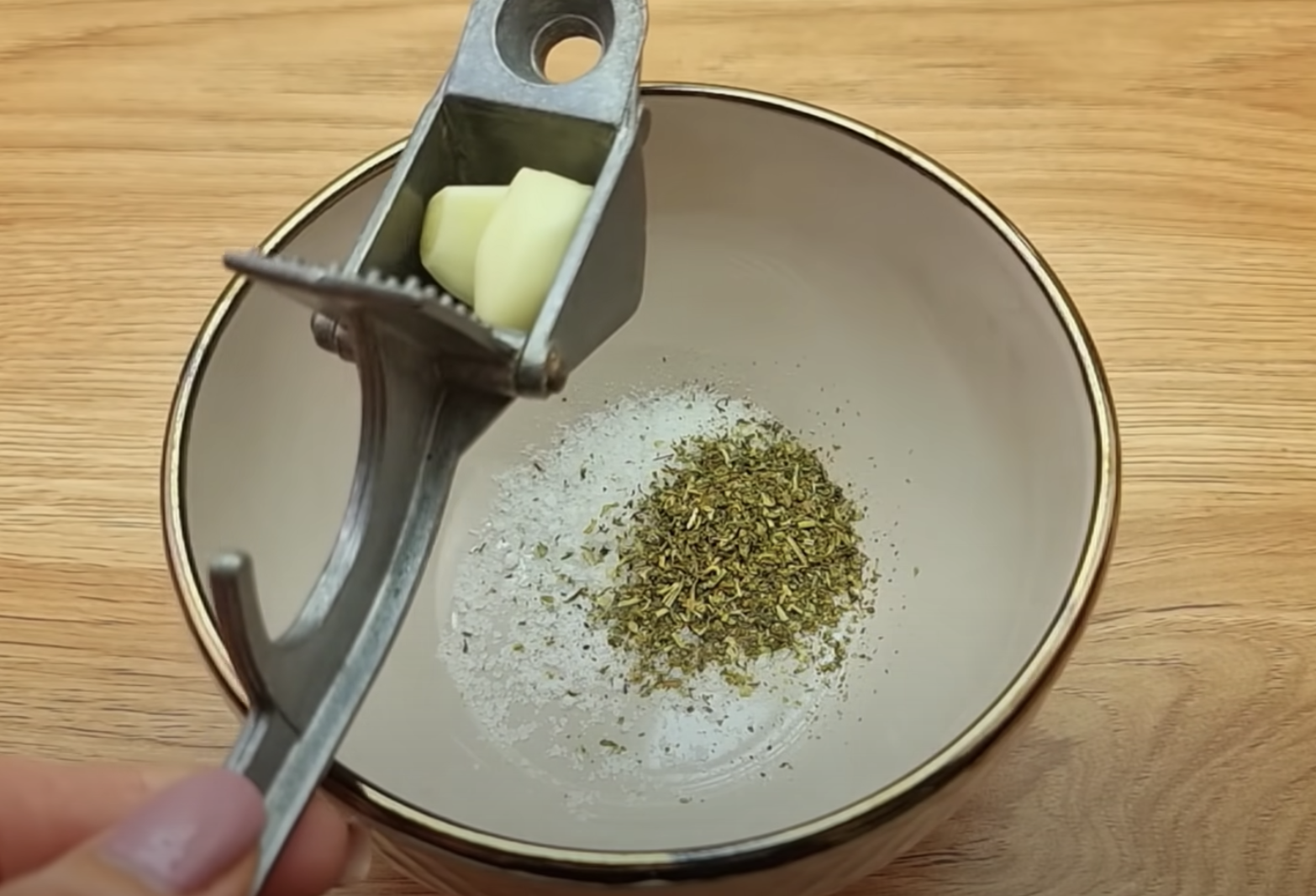 Następnie należy przygotować sos, wyciskając czosnek i mieszając oliwę, sól i resztę.