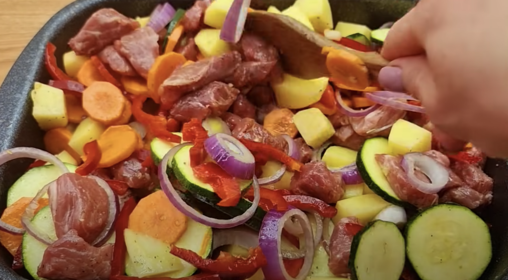 Wymieszaj go dobrze z mięsem i warzywami. Umieść przykryte składniki w naczyniu wyłożonym folią i papierem do pieczenia.