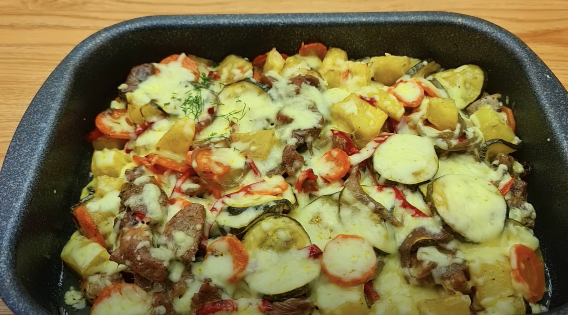 Piec przez około godzinę. Po wyjęciu blachy do pieczenia odkryć składniki i posypać je tartym serem. Ponownie wstawić do piekarnika na 10 minut.
