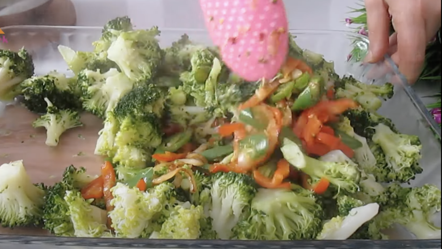 Teraz ułóż brokuły i cebulę z papryką w natłuszczonym naczyniu do pieczenia.