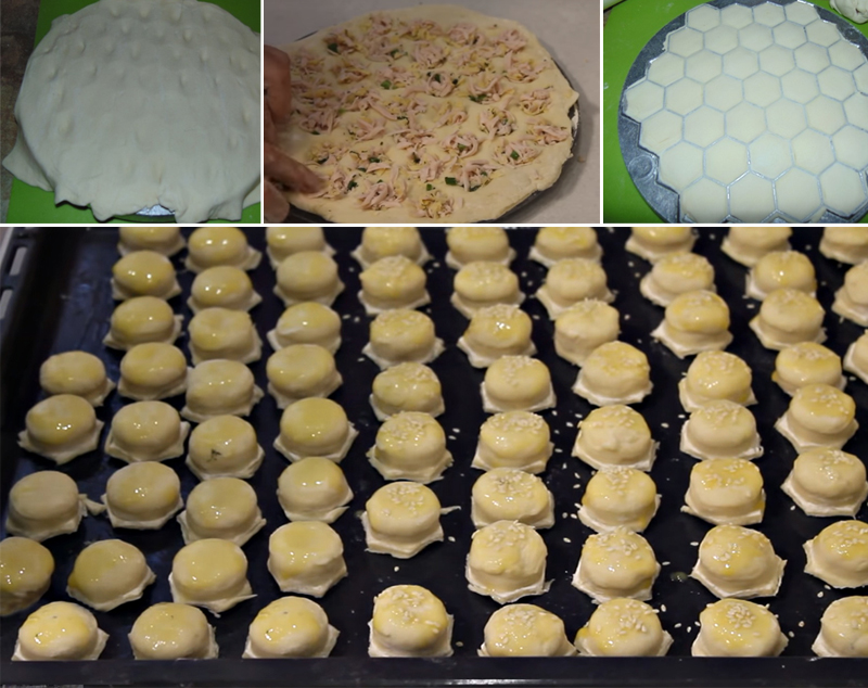 Posyp ją obficie mąką, a następnie rozłóż na niej jedną warstwę ciasta. We wgłębieniach powstałych z użycia formy umieść przygotowany farsz.  Połóż na warstwę z farszem kolejny blat ciasta. Rozwałkuj. Wyciśnij bułeczki z formy.
