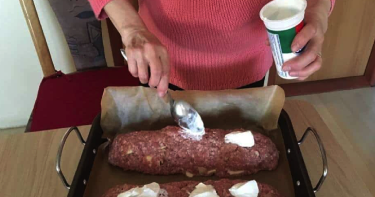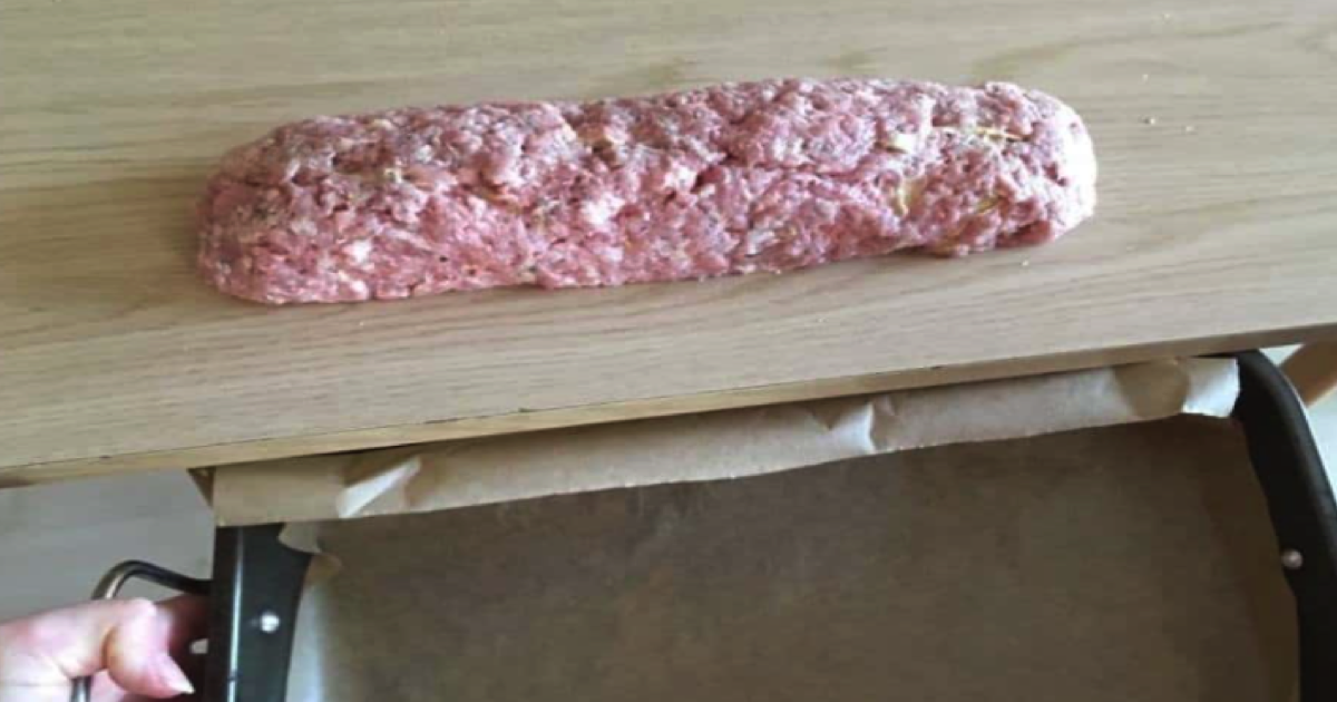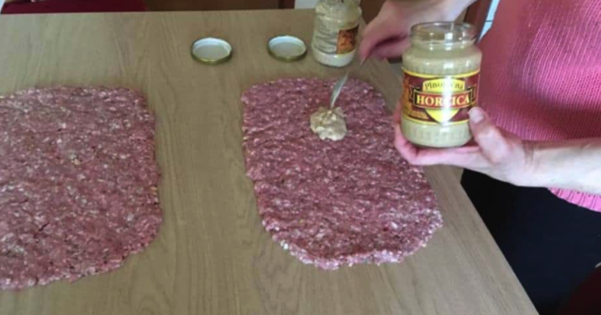 Kolejnego dnia dzielimy przygotowane wcześniej mięso no równe połowy. Formujemy z nich dwa płaskie, prostokątne placuszki, smarujemy ulubioną musztardą lub keczupem a na koniec posypujemy startym serem.