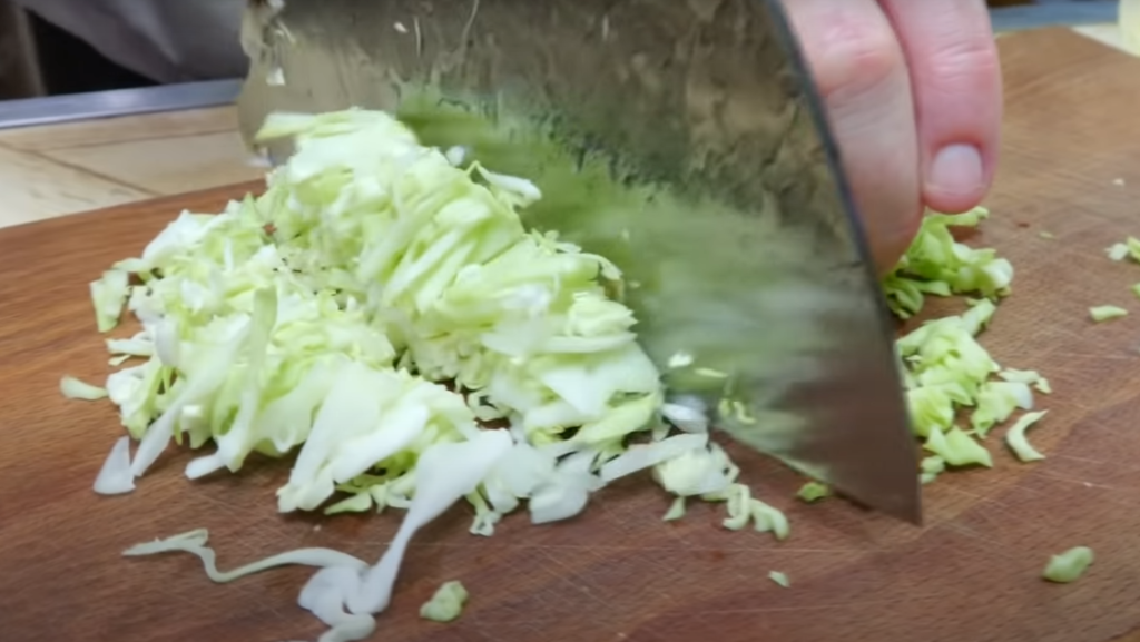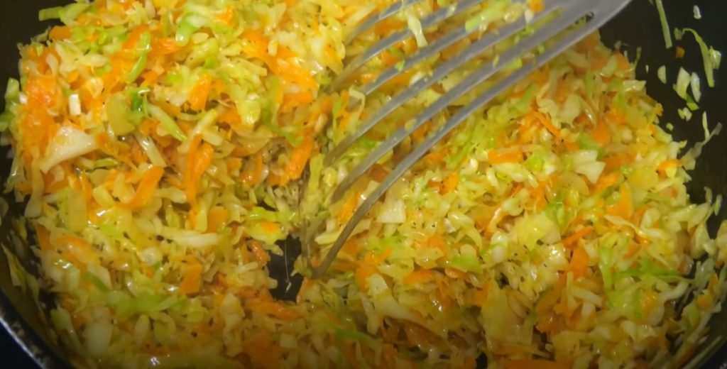 Na patelnię wlej olej, podsmaż cebulę, dodaj marchewkę i na koniec kapustę. Gotuj razem przez około 15 minut, następnie posól, dopraw i wymieszaj.