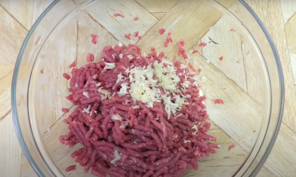 W misce mieszamy oba rodzaje mięsa mielonego ze zmiażdżonym czosnkiem, solą i pieprzem.