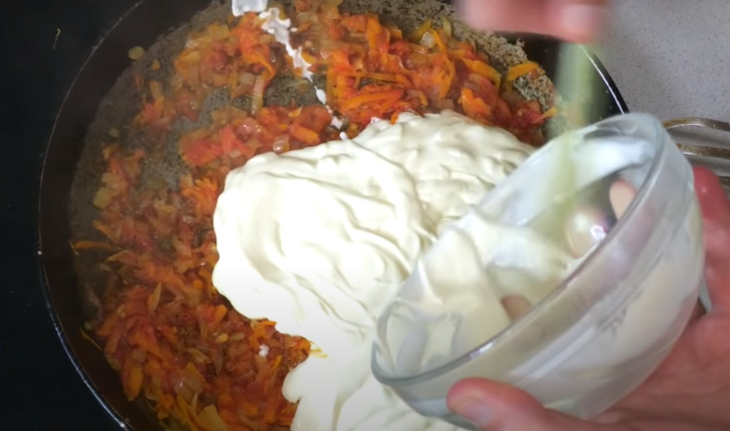 Teraz przygotuj sos. Cebulę drobno posiekaj, marchewki utrzyj na grubej tarce, a także pomidory bez skórki. Na patelnię wlej trochę oleju roślinnego, podsmaż cebulę z marchewką i pomidorami do miękkości, posolić, doprawić i posypać cukrem do smaku. Na koniec dodaj śmietanę.