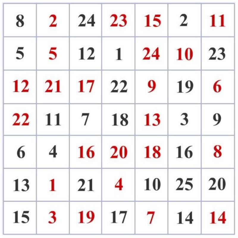 Jak najszybciej znajdź liczby kolejno od 1 do 25 wymawiając je na głos. Najistotniejsze podczas tego zadania jest, aby nie odwracać wzroku od środka stołu. Szukanie liczb ma odbywać się poprzez widzenie peryferyjne.