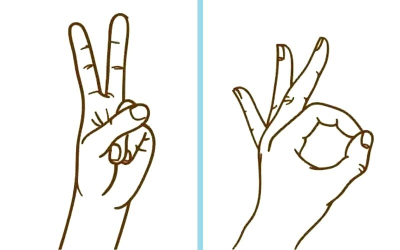 Palcami prawej dłoni wykonaj znak zwycięstwa „V” a lewej znak „OK”. Po czym szybko zmień ustawienie-prawą dłonią wykonaj „OK” a lewą „V”.