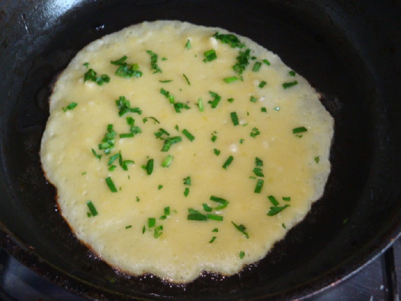 Na rozgrzaną patelnie wlej małą ilość oleju roślinnego i smaż cienkie naleśniki. W czasie smażenia możesz je doprawić ulubionymi ziołami.