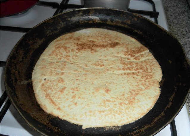 Każdą część osobno rozwałkować na wielkość naszej patelni (około 21 cm). Placki należy upiec na suchej i dobrze rozgrzanej patelni. Takie kawałki pieką się bardzo szybko, należy uważać, aby nie przypalić.