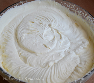 W misce łączymy śmietanę, puddingi na zimno, mleko, cukier puder i cukier waniliowy. Dokładnie mieszamy całość przez 5 minut na sztywną masę.