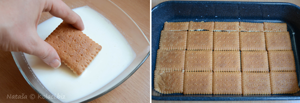 Herbatniki zanurzamy w mleku i układamy je na dnie formy.