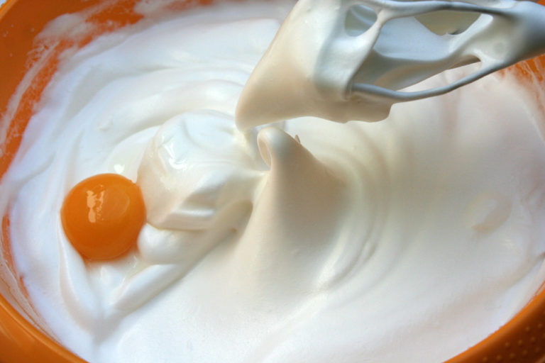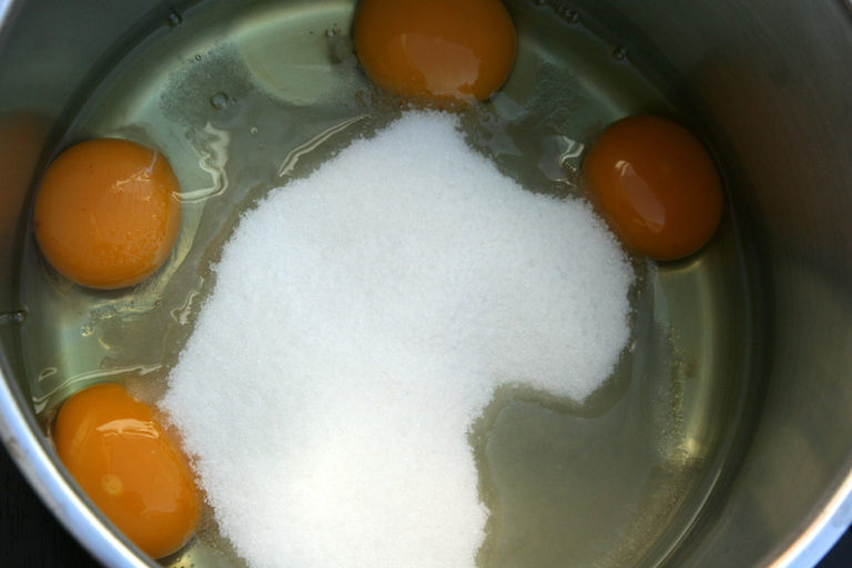 Do białek, ciągle mieszając, dodawać pojedynczo żółtka jajek.