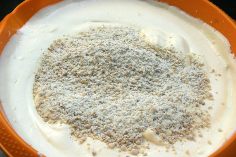Zmieszać 160 gram mąki z orzechami, a następnie ją z masą z jajek.