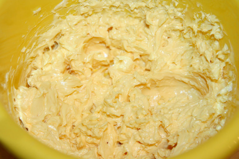 Następnie należy rozgnieść miękkie masło. Tak przygotowane masło dodawać po łyżce do schłodzonego kremu z poprzedniego punktu – przez cały czas mieszając do uzyskania jednolitej gęstej masy.