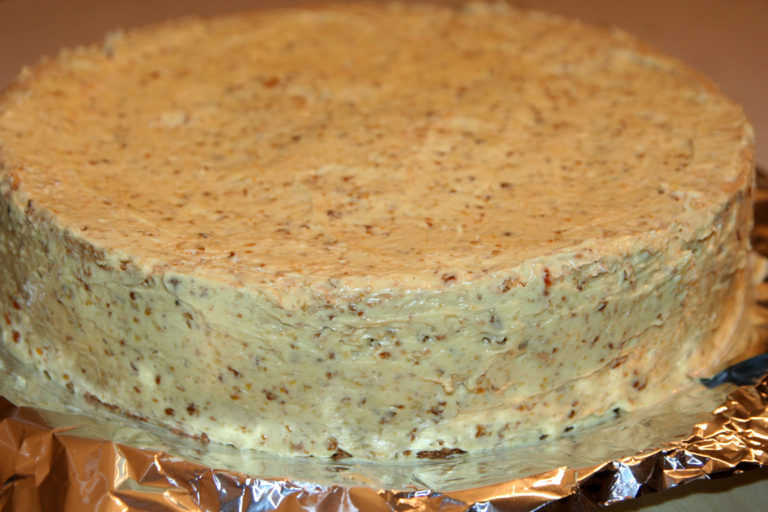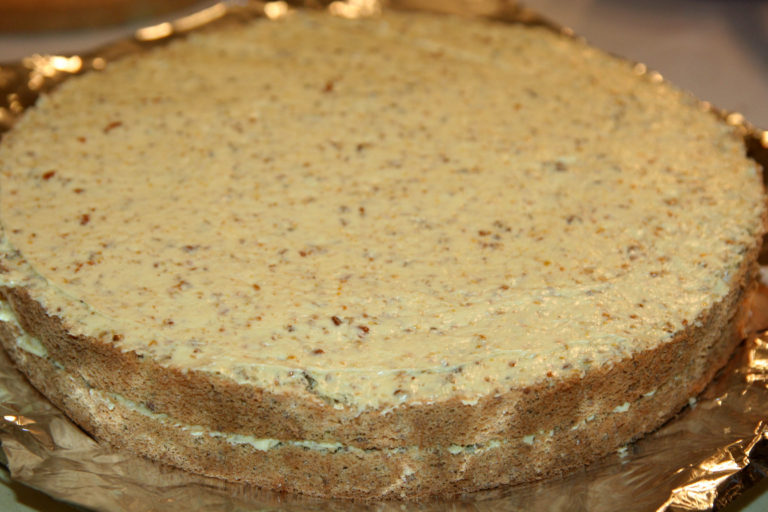 Po umieszczeniu ostatniej części ciasta – rozsmarować pozostały krem, rozprowadzając go również na boki ciasta.