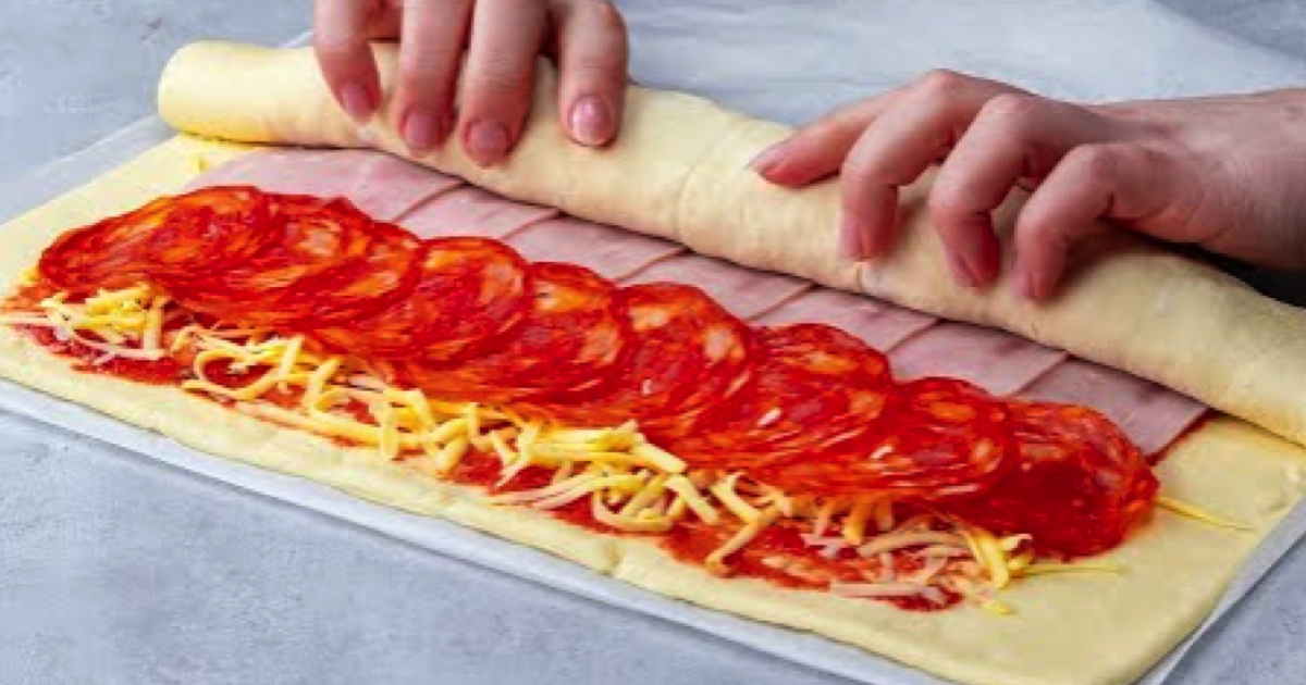 Ciasto rozwałkuj, by powstał cienki prostokąt. Rozsmaruj na nim równomiernie 100 g sosu pomidorowego, posyp serem i 3 g oregano. Ułóż po jednym rządku salami, szynki i pikantnego salami.