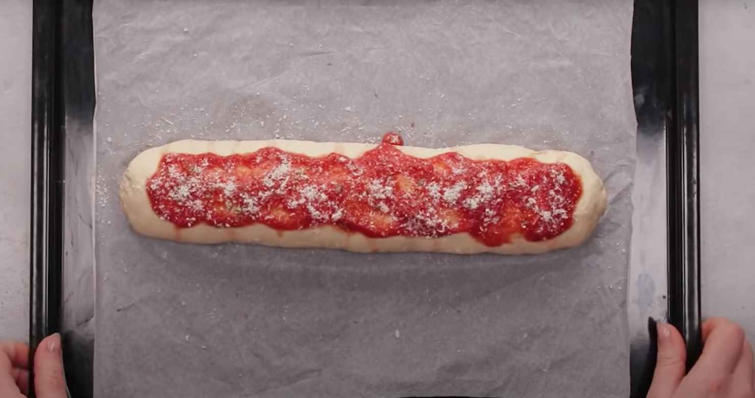 Zwiń ciasto w rulon, zaciskając końce tak, by nadzienie nie mogło wypaść. Posmaruj po wierzchu pozostałym sosem pomidorowym i posyp tartym parmezanem oraz oregano.